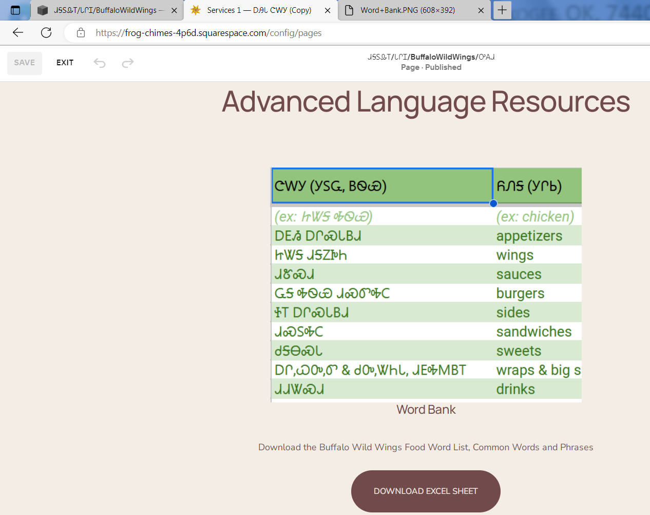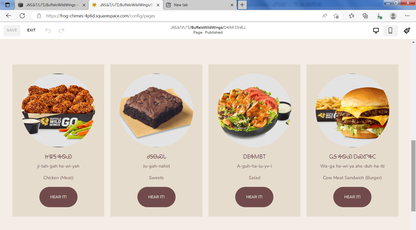 THE “MENU” IS THE 3 PAGES ᏩᏘᏰᎵ ᎤᏬᏢᏅᎢ & the pictures with audios. “audios” are youtube links but squarespace should also let audio files (& video) be placed.